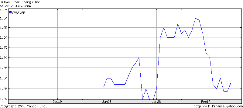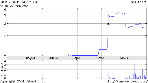 Viel mehr Fakten zu dem Unternehmen Silver Star werden nicht geliefert, es wird nun lediglich ueber die Energiekrise in Kalifornien gesprochen. Es wird noch eine Chartanalyse angestellt. Bei einem taeglichen Handelsvolumen von rund 25.000 Aktien (bei dem Aktienkurs von $1,5 kann man also fuer $32.500 den gesamten Tagesumsatz aufkaufen) spricht man dann von Kursmuster und Stochastik.