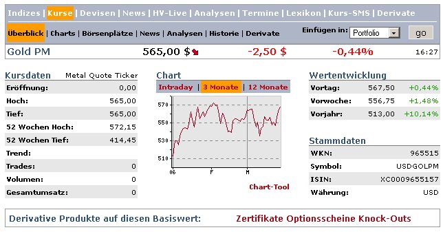 Aber offenbar darf der Redaktion dieser ungewöhnlich steile Anstieg keine einzige Zeile wert sein! Stattdessen kann der geneigte Leser sich in der Rubrik "Wirtschaft" über so unendlich viel wichtigere Ereignisse wie den Achtzigsten Geburtstag des Herrn Kamprad, die Sorgen des Herrn Mehdorn und die Sehnsüchte der Hedge-Fonds-Manager informieren. Wen kümmert da der Goldpreis?