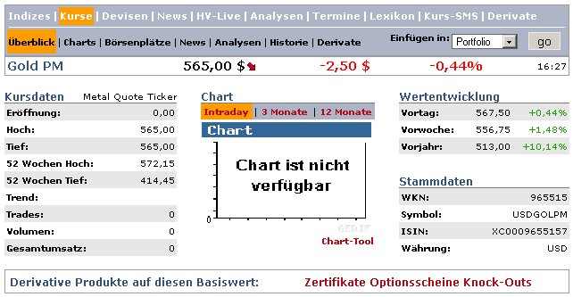 Aber da, ganz am rechten Rand der Seite gibt es eine Notierung für den Goldpreis, dahinter steht in leuchtendem Rot -0,44%.