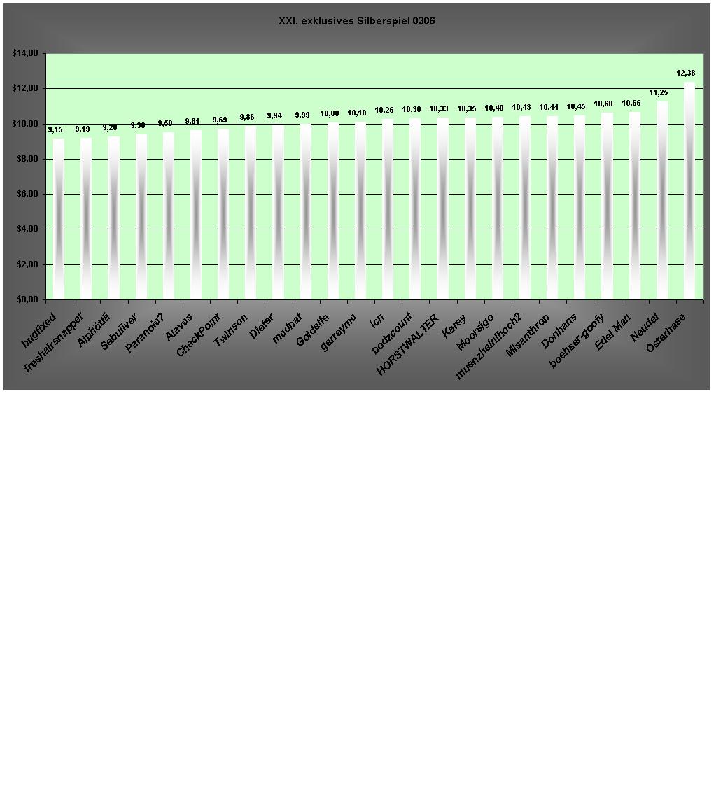 Auf der einen Seite wünschen wir uns natürlich einen Silberkurs über 10, sieht einfach gut aus ,,,,auf der anderen Seite würde ich aber gerne noch ein paar mir fehlende Münzen zu guten Preisen kaufen bevor Silber noch mehr steigt....Also ein kleiner Kompromiß und eine schöne Zahl