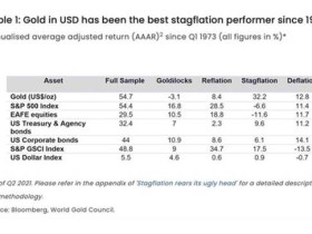 Gold entwickelt sich in Stagflation-Phasen gut und übertrifft in Rezessionen die Entwicklung von Aktien.