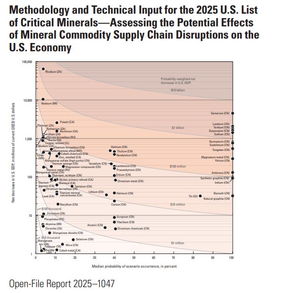 Es ist das, was die USGS nennt - eine datengesteuerte Risikobewertung von Störungen der Rohstoffversorgungskette." Die Grafik zeichnet verschiedene Mineralstoffe auf der Grundlage zweier Faktoren: die Wahrscheinlichkeit einer Unterbrechung der Lieferkette und die möglichen wirtschaftlichen Auswirkungen einer solchen Störung. Die Mineralien sind als Punkte auf der Grafik dargestellt, und ihre Lage zeigt ihr Gesamtrisiko an.