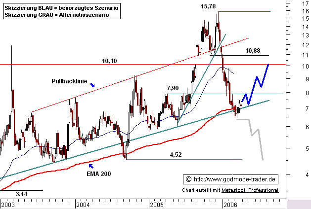 ERDGAS - Stabil über Kreuzunterstützung - UpdateKurz-Kommentierung: Erdgas befindet sich langfristig in einer stabilen Aufwärtsbewegung. Dabei kam es Mitte 2005 zu einer extremen Verschärfung der Rallye bis auf ein Hoch bei 15,78 $ im Dezember 2005. Von diesem Niveau aus kippte der Kursverlauf in den Vormonaten massiv nach unten ab. Ein leichter Ausbruch aus dem bei 7,00 $ liegenden langfristigen Aufwärtstrend sowie der dort liegenden exp.GDL 200 (rot) erfolgte in den Vorwochen, dieser stellt sich aber zunächst als Bärenfalle dar. Nachdem die Aufwärtstrendlinie jetzt wieder leicht zurück erobert werden kann, bietet sich die Möglichkeit einer nachhaltigen Erholung. Zunächst können 7,90 $ erreicht werden, darüber bietet sich auf Sicht mehrerer Wochen Kurspotenzial bis 9,00 $. Kippt Erdgas hingegen nochmals unter das kurzfristige Tief bei 6,45 $ auf Wochenschlussbasis ab, wird ein weiterer Kursrückgang in Richtung 4,52 $ auf mittelfristige Sicht wahrscheinlich.