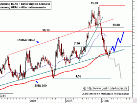 ERDGAS - Stabil über Kreuzunterstützung - UpdateKurz-Kommentierung: Erdgas befindet sich langfristig in einer stabilen Aufwärtsbewegung. Dabei kam es Mitte 2005 zu einer extremen Verschärfung der Rallye bis auf ein Hoch bei 15,78 $ im Dezember 2005. Von diesem Niveau aus kippte der Kursverlauf in den Vormonaten massiv nach unten ab. Ein leichter Ausbruch aus dem bei 7,00 $ liegenden langfristigen Aufwärtstrend sowie der dort liegenden exp.GDL 200 (rot) erfolgte in den Vorwochen, dieser stellt sich aber zunächst als Bärenfalle dar. Nachdem die Aufwärtstrendlinie jetzt wieder leicht zurück erobert werden kann, bietet sich die Möglichkeit einer nachhaltigen Erholung. Zunächst können 7,90 $ erreicht werden, darüber bietet sich auf Sicht mehrerer Wochen Kurspotenzial bis 9,00 $. Kippt Erdgas hingegen nochmals unter das kurzfristige Tief bei 6,45 $ auf Wochenschlussbasis ab, wird ein weiterer Kursrückgang in Richtung 4,52 $ auf mittelfristige Sicht wahrscheinlich.