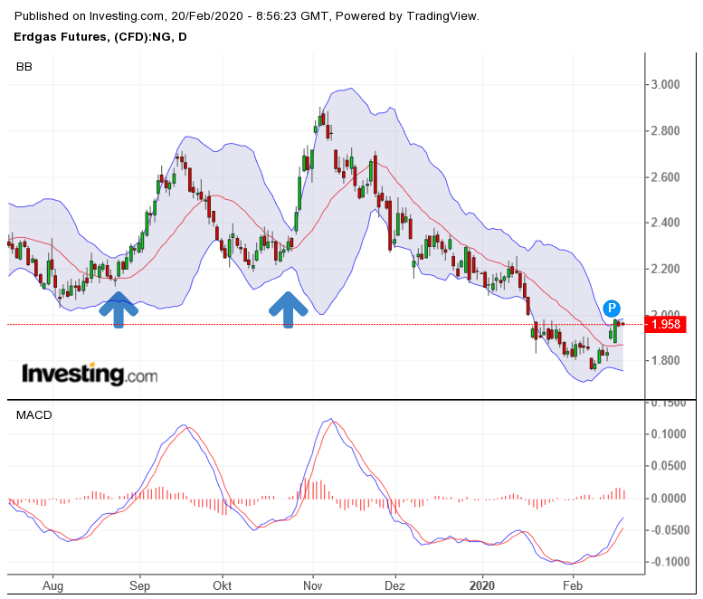 Positiv: Der Kurs im Tageschart ist über dem mittleren Bollingerband.