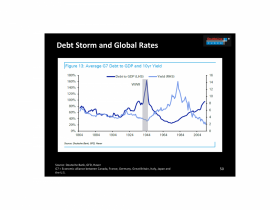 "Debt Storm and Yields" mit Langfrist-zinsen 10-jähriger Anleihen versus Durchschnittsverschuldung aller G7-Nationen: