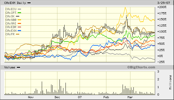 We know that Hothschild will be doing some drilling this spring both at the Tecalote prospect, and also in the property surrounding the existing deposit at Moris. EXM has some work underway already at Reyna De Oro, and will likely have at least one drill turning there within 6 months, to follow up on the excellent results from last year. On top of that JV partner Yale Resources (V.YLL) plans to get a drill turning at the Urique property this summer, once they have completed the trenching/sampling preliminary work. And JV partner Penoles has already confirmed that another drilling program will be going this spring/summer at Magurachic (sp?) to probe the deeper targets. With all of that work underway, most of it budgeted and paid for by other companies, there will be a lot to look forward to as EXM shareholders. And also, dont forget that we have a new drill that is committed to our projects and they will start by drilling the Guanajauto project this spring. We could be in line for a nice surprise there too, before the drill moves to Reyna.
