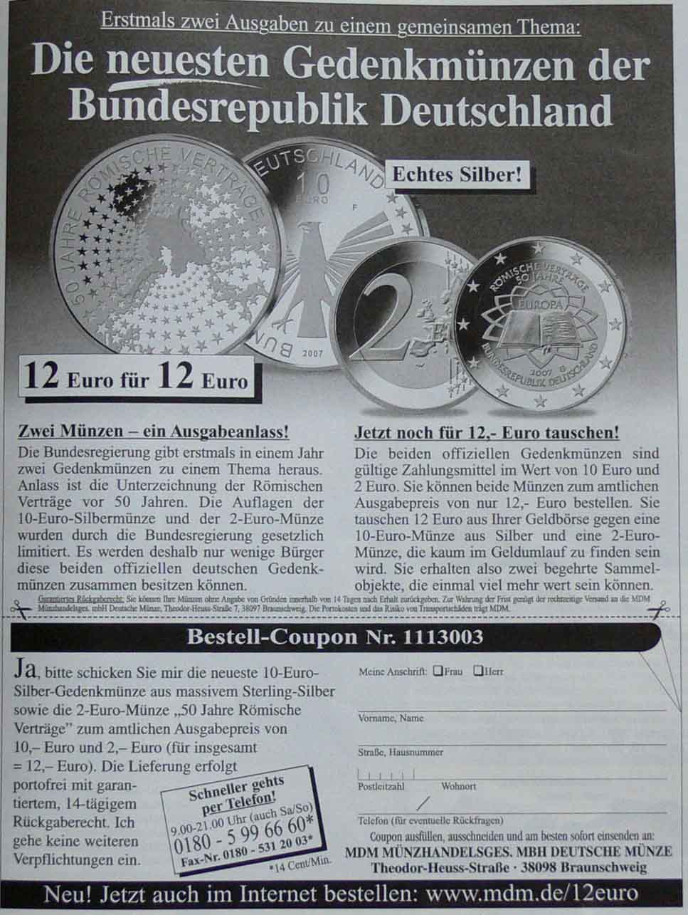 Neue Bestellmöglichkeit für die 12 Euronen (10 EUR + 2 EUR "Römische Verträge").