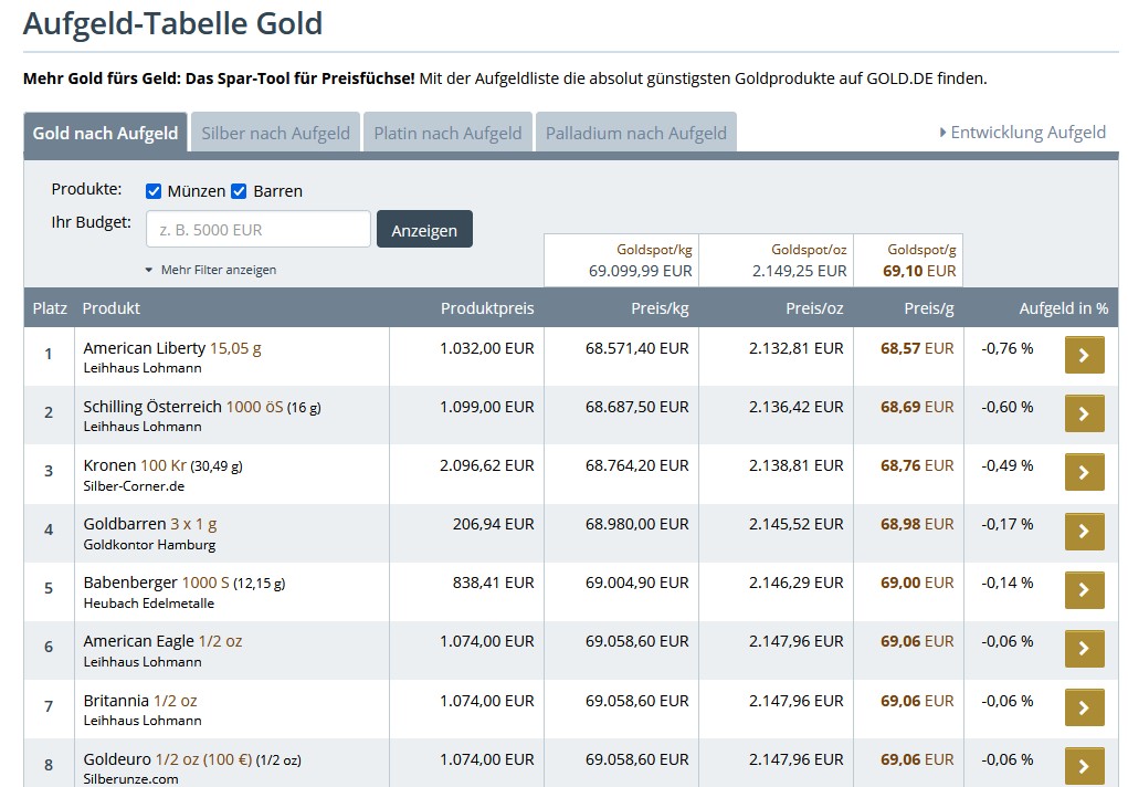 Ein Blick in die Aufgeldtabelle von gold.de erleichtert die Schnäppchenfindung (und das ist nur gold.de, Ex-Goldheinz hat vielleicht noch billigeres).