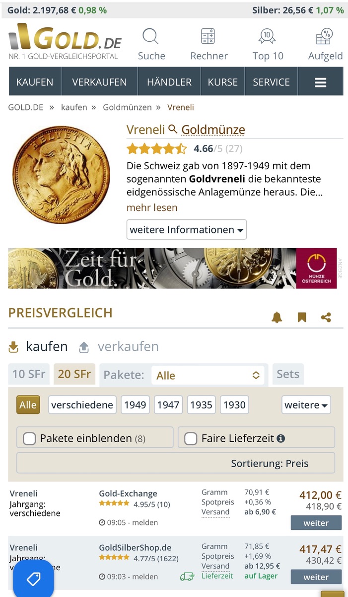 Geiger Edelmetalle - 20 Kronen - 422€, d.h. aktuell 1,1% unter Spot