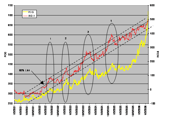 When Indicator A approaches the 60% line very sharply it tends to fail and fall back (creating some down days but offering entry points for latecomers). This was the case at POG $468 and $560. When the slope is more gentle, as is the case now, the rally usually continues and Indicator A continues toward the top of the channel and an eventual Intermediate Top.