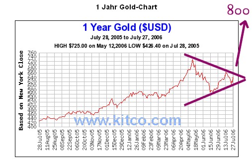 ich bin zu sehr Realist um Wunschdenken anheimzufallen. M.E. ist Gold in der Korrektur nach Phase 1 genau wie Richard Russell es sieht. Diese Korrektur wird m.E. nicht über den Preis sondern über Zeit entschieden, d.h. bis Ende 2006 und mit vielleicht unbstimmter Verlängerung in 2007. Alles was wir bis dahin an neuen Tiefs sehen ist ein unverhofftes Geschenk. Was wäre denn bei $450? Natürlich sollte man dann kaufen. Wetten viele der jetzigen Bullen werden dann genau das Gegenteil machen?