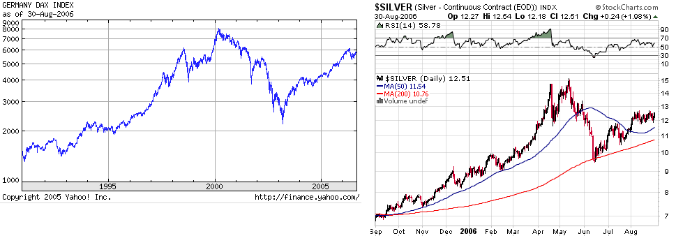 Strategie wäre dann wie folgt: wenn's kracht, dann krachen wir mit Gold/Silber mal wieder zuerst. Dann aber werden auch die Aktienmärkte krachen. Da Gold und Silber viel schneller reagieren, sollte man nach einem evtl. Silbercrash einfach den Dax shorten, da der erst mit Verzögerung so stark fallen dürfte.