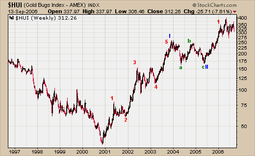 Ich würde nicht auf ein kurzfristiges Retracement setzen. Es könnte einfach weiter runter gehen. Während aber die Elliot-Wave Auguren 170 oder 160 oder 120 bis sogar 90 im HUI vorhersagen (3 Jahre) könnte es sein, daß vielleicht doch Phase 1 2003 zu Ende gegangen ist! Siehe 2. Grafik.