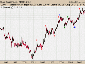 Ich würde nicht auf ein kurzfristiges Retracement setzen. Es könnte einfach weiter runter gehen. Während aber die Elliot-Wave Auguren 170 oder 160 oder 120 bis sogar 90 im HUI vorhersagen (3 Jahre) könnte es sein, daß vielleicht doch Phase 1 2003 zu Ende gegangen ist! Siehe 2. Grafik.