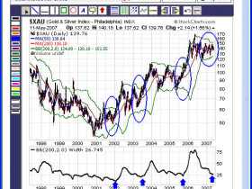 ".....One thing that has me so bullish about gold stocks is the fact that the 200-day bollinger bands are coming closer together on the XAU than they have been ever since I started to follow gold stocks in 2002. The 200-day bollinger bands measure the long-term volatility of a stock or index and when they come together it means that a trend of long-term consolidation is about to end and a new long-term trend is about to begin. We seen this happen in 2005, 2003, and 2002 in gold stocks and each time it did a huge new uplegs in the gold bull market occurred. The fact that the bollinger bands are more narrow than they were during those times suggests that the next upleg may dwarf the previous ones....."