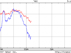 At this hour the HUI is being dragged down by general stock market weakness being unable to breach resistance near 344.