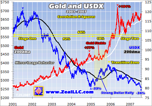 The transition zone from Stage One to Stage Two is marked above on this chart. It happened in mid-2005 when gold held stable despite a powerful USDX rally.