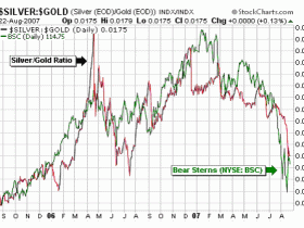 Clearly, as confidence has ebbed and flowed over the past two years, as indicated by the performance of Bear Sterns, so has the silver/gold ratio. Therefore, those who were wondering why silver has been weak relative to gold over the past 6 months should wonder no more.