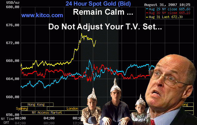 Die Großbanken jedenfalls decken sich nun massiv mit kurzlaufenden Zentralbankrediten ein und werden wahrscheinlich versuchen, in der nächsten Zeit ihre dafür hinterlegten Sicherheiten, vor allem in der Form von Aktien und Anleihen zu verkaufen. Vielleicht auch Gold, das man damit unter Kontrolle halten könnte. Den Subprime-Müll hingegen müssen sie wohl für längere Zeit in die eigenen Bücher nehmen und daran arbeiten, dafür erstmalig eine realistische Marktbewertung zu erzielen, was im besten Falle, also ohne weitere Crashattacken, zumindest einige Monate dauern wird, wahrscheinlicher sind aber einige Jahre.