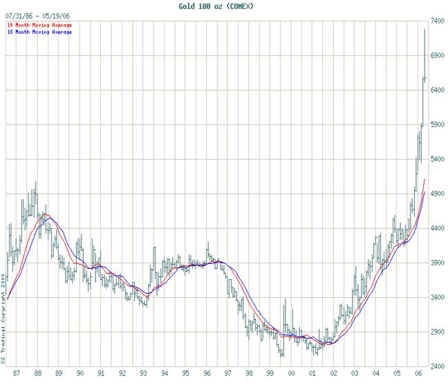Several months back I predicted that this particular leg up in the gold Bull Market would not top out until we hit a minimum price of 728.60. Time wise, I was looking for mid-summer. At that particular point in time we were trading around 590.00 and my target seemed a bit optimistic to say the least. As luck would have it, we hit 728.00 on May 11th and have since traded above it (intraday) on two separate occasions. So much for mid-summer! Such lofty levels have led to a dramatic increase in volatility and many people have mistakenly assumed that volatility implies a top. Fortunately nothing could be further from the truth. All that can be implied from increased volatility is an increase in losses for the average trader. A $44.00 trading range in gold, such as we experienced on Thursday May 18th, eats stop/losses for breakfast. The investor who cut his teeth on the NASDAQ bull market is going to learn the hard way that this is a different breed of Bull.