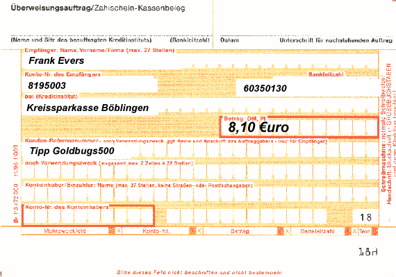 Vor Spielbeginn muß der Eingang auf Frank Ewers Konto erfolgen. ( Siehe Überweisung im Anhang)