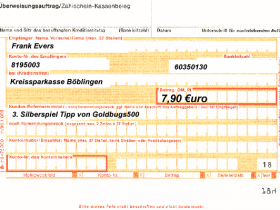 Entweder der Mitspieler überweist 7,90 € an Frank oder er sendet (teuer aber anonym) eine Feinunze 999 o. 9999 per "Post" an Frank Ewers.