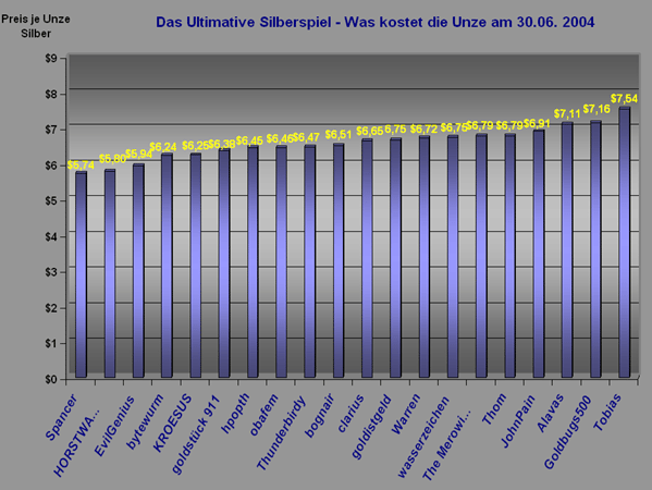 Insgesamt beteiligten sich 20 User. Der Mittelwert all unser Silber Experten beträgt Ø 6,56 $!