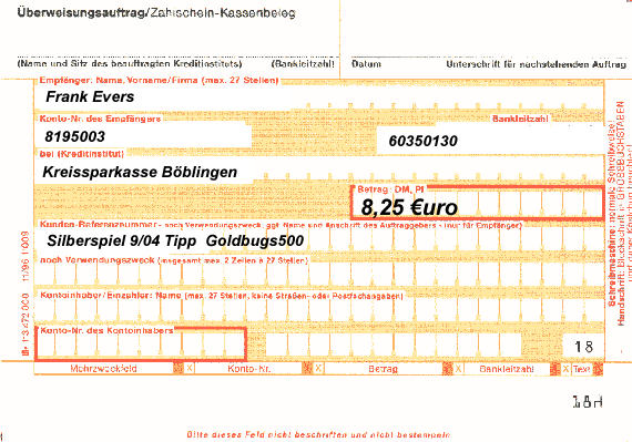 Entweder der Mitspieler überweist 8,25 € an Frank oder er sendet (teuer aber anonym) eine Feinunze 999 o. 9999 per "Post" an Frank Ewers.