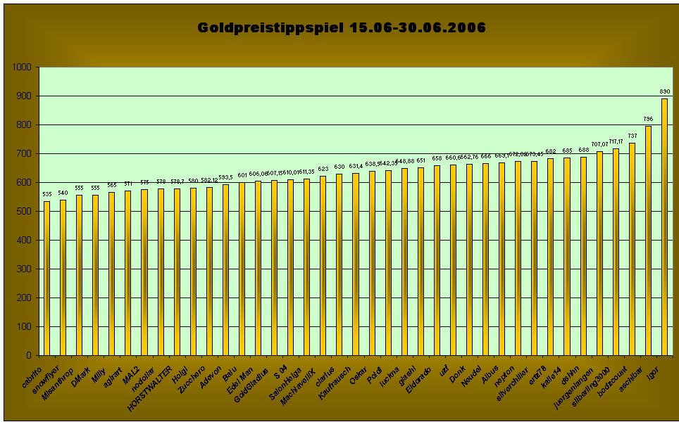 Nach meinen Informationen lag der Schlusskurs von Gold in NY am 30.06.2006 bei 612,40. Damit hat der Tipper: