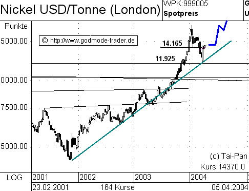 Ich persönlich tendiere zur 1. Variante, d.h. ich gehe davon aus, dass es sich um eine Konsolidierung des Aufwärtstrendes handelt, welcher bald wieder aufgenommen werden dürfte. Allerdings muss ich zugeben, dass mir der Nickelchart doch etwas zu denken gibt - er sieht schon etwas nach Topbildung aus und auch scheint der Aufwärtstrend gebrochen zu sein (siehe angehängten Nickel-Chart der London Metals Exchange)....