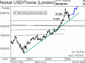 Ich persönlich tendiere zur 1. Variante, d.h. ich gehe davon aus, dass es sich um eine Konsolidierung des Aufwärtstrendes handelt, welcher bald wieder aufgenommen werden dürfte. Allerdings muss ich zugeben, dass mir der Nickelchart doch etwas zu denken gibt - er sieht schon etwas nach Topbildung aus und auch scheint der Aufwärtstrend gebrochen zu sein (siehe angehängten Nickel-Chart der London Metals Exchange)....