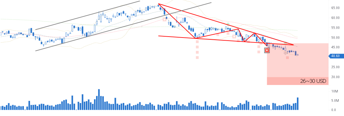 50 USD als Einstieg wäre demnach noch zu hoch. Preise an der unteren Trendunterstützung wären perfekt...