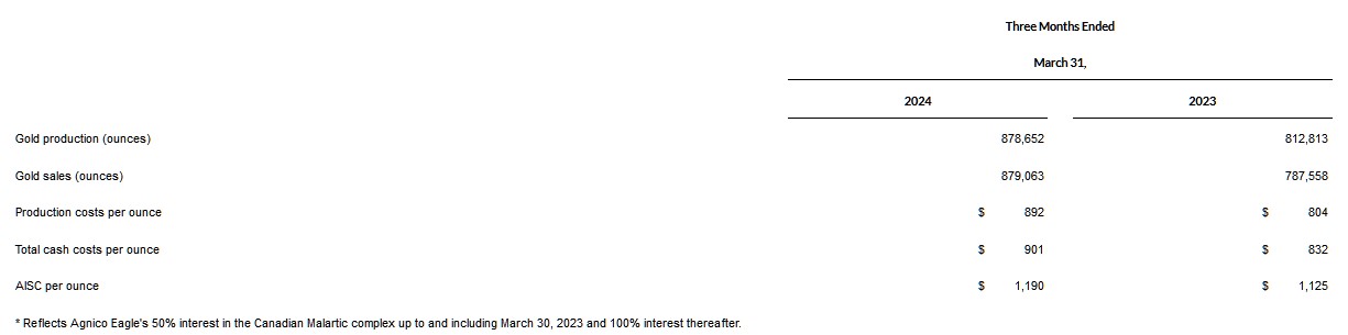 Starke vierteljährliche Goldproduktion - Die zahlbare Goldproduktion1 im ersten Quartal 2024 belief sich auf 878.652 Unzen bei Produktionskosten pro Unze von 892 $, Gesamt-Cash-Kosten pro Unze2 von 901 $ und All-in Sustaining Costs ("AISC") pro Unze3 von 1.190 $. Die Goldproduktion im ersten Quartal 2024 wurde von einer Rekord-Quartalsproduktion bei Canadian Malartic und einer starken Produktion bei Macassa und den Betrieben des Unternehmens in Nunavut angeführt