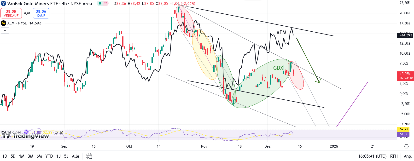Während Gold und die Minenindices noch von Mehrjahres Hochständen entfernt sind, fallen diese bei ersten Minenaktien, u.a. mit AEM auch bei KGC und WDO.
