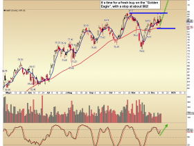 Jetzt bei 84 USD und müßte fast an der oberen Trendlinie sein.