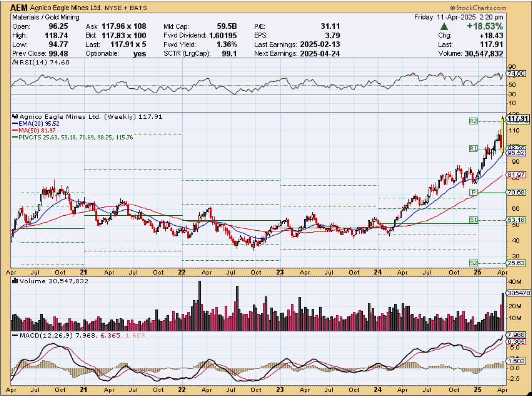 AEM gestern und heute mit neuen Allzeithochs, momentan 115,8 $ bzw. 160,4 C$