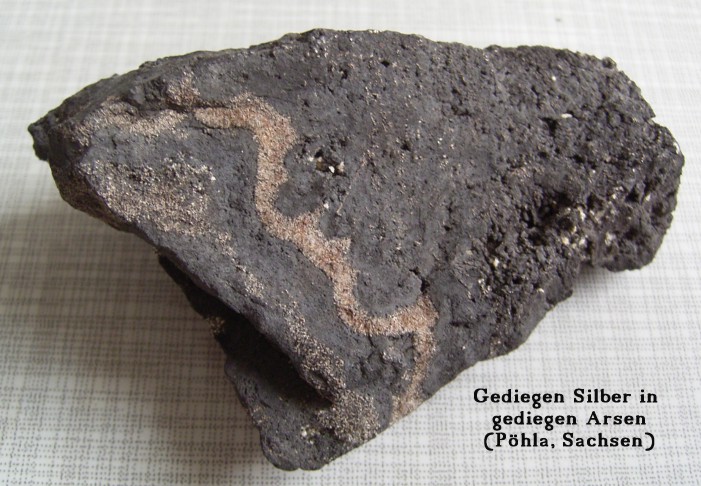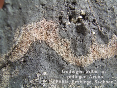 Es handelt sich also bei diesem speziellen Stück um gediegen Silber in gediegen Arsen, wobei das Arsen (ich rücke gerade mein Spitzenhäubchen zurecht) offenbar zum sogenannten "schwarzen Arsen" gehört, bzw. einer Unterform davon, die dann entsteht, wenn gediegen Arsen über 270° Celsius erhitzt wird.
