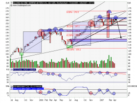 ZitatSchlussfolgerung für mich war: der Dow sollte bis Ende 2007 oder im ersten Quartal 2008 den Bereich seines Baisse-Tiefs noch einmal anlaufen, sprich 7200+-x. Damals kannte ich das Princeton-Model noch nicht. Es bestätigt mich nun allerdings in meiner Meinung. Prognose wäre somit: Dow 7200+-x im Laufe des März 2008. Unwahrscheinlich ? Was meint Ihr ? Etwas charttechnisches, falls ich doch darf. Beobachte explizit die Allianz seit etwa drei Monaten wegen der Ähnlichkeit des Kursverlaufes gegenüber dem vom letzten Jahr. Preis, Zeit, Indikatoren.....Der Chart erklärt sich selbst, meine ich. Was meinst Du, Spica ? Was lassen die Aspekte für die Allianz vermuten ? Bin jedenfalls short im Dax gegangen, gestern nachbörslich bei 7115. Etwas riskanter. Ein 7250er Put, Laufzeit Mitte Mai.