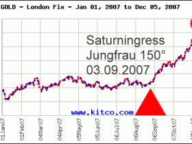 Gewiss spielt hier auch die Saisonalität von Gold eine Rolle, man darf aber nicht verkennen, das sich Gold seit Anfang Februar 2007 in einer Range bei 650-680 sehr lange seitwärts bewegte. Exakt solange, bis sich die beschriebenen Veränderungen zum September 2007 vollzogen. Eine Veränderung die ich wohl als einziger Finanz-Astrologe ( laut Tschonko auch Merriman - siehe Nachtrag ) mit dem Eintritt des Saturn in die Jungfrau in Zusammenhang brachte und nicht nur tagegenau prognostizierte, sondern zudem auch detailiert das Gebiet angab auf dem sich die Veränderungen zu diesem Zeitpunkt dann auch tatsächlich vollzogen.