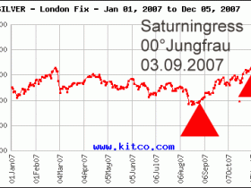 Betrachtet man nachträglich die im voraus veröffentlichten Aussage von Spica zum Übertritt des Saturn in die Jungfrau, der am 03.09.2007 erfolgte, und blickt in die beiden Charts von Gold und Silber, weil wie dargelegt, mit einem erheblichen Anstieg des Gold- und des Silberpreises zu diesem Zeitpunkt zu rechnen war, so sieht man, wie der Goldpreis vom Anfang September bis Anfang November 2007 regelrecht explodierte.
