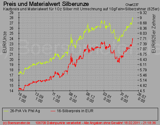 Langsam aber sicher kommt man bereits jetzt schon wieder in den keiklen Bereich, maximal noch 3 Euro Anstieg und man kann sich darauf einstellen, das das Ende des Silbers im Zehner verkündet wird.