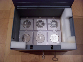 Anbei nach ein paar Bilder wie ich meine schönen 10er aufbewahre (wie gesagt das ganze ist Hobby). Damit die 10er nicht einfach so in einem Tresor rumliegen und hin und her rutschen, habe ich eine fabrikneue Geldkassette aus einer Zeit gekauft, wo Geld d.h. Münzen noch wirklich aus Edelmetall waren – irgendwie finde ich dass das eine würdige Aufbewahrung für 10 Euro Silbermünzen ist =)