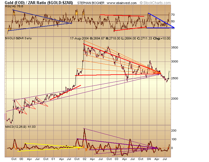 Sprung über diese Hürde, steht einer Befestigung in Richtung der massiven Widerstandszone bei rund 6,95 ZAR zu 7,05 ZAR, die aus mehren alten Hoch- und Tiefpunkten resultiert, nur noch das Zwischenhoch vom 10. Juni 2004 bei 6,70 ZAR im Weg.