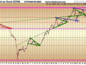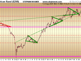 Sprung über diese Hürde, steht einer Befestigung in Richtung der massiven Widerstandszone bei rund 6,95 ZAR zu 7,05 ZAR, die aus mehren alten Hoch- und Tiefpunkten resultiert, nur noch das Zwischenhoch vom 10. Juni 2004 bei 6,70 ZAR im Weg.