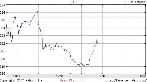 The HUI is down again this time ignoring the bit of strength in the US equity markets and keying off of the gold movement. It is hovering around that all important 320 level. If it cannot get back up above there, down she goes to probably a first stop somewhere around 313-314.