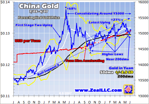 Now you sharp-eyed students of the markets have no-doubt noted that the China gold bull looks an awful lot like the US gold bull. Indeed. This is largely due to the yuan currency peg which existed for the decade ending July 2005. As you can see above reflected in the red yuan price, the Chinese currency was dead flat for the first four years of this gold bull. It was hard-pegged at 8.28 yuan to one US dollar, or a little over $0.12.