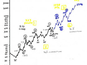 768 – 2304 = 1536 points 3 times (assumption using the Fibonacci number of 3).So if our Elliot wave count and assumptions are correct the HUI should approach the 2304 area in 2010. We have used a lot of assumptions but to project an Elliot Wave target assumptions are needed.