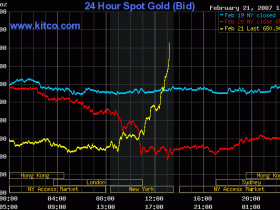 “We have the possible makings of a key reversal here CBOT futures hit $703 while NY marked $680 in futures,” wrote Jon Nadler of Kitco.com in an e-mailed update.