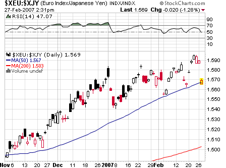 Trotz der Yenstärke ist der Yen wegen des gefallenen US$ heute nicht unter das letzte Kurstief gegenüber dem Euro gefallen. Ich denke der trend ist noch intakt. Bei den Aktienmärkten zwar niedrigere Tiefs, aber keine niedrigeren Hochs. Ich denke ab morgen früh wird wieder massiv Yen geliehen und in diverse Anlageklassen gesteckt, so daß wir an den Aktienmärkten nach morgen vielleicht etwas niedrigeren Kursen in nächster Zeit ein Doppeltop sehen können. Wobei dann der Yen gegenüber Euro bei über 160 landen könnte.